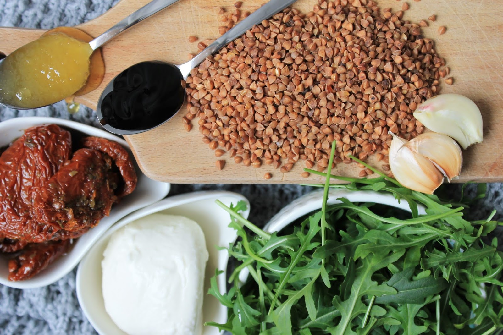 Teraz pora na sos do sałatki. Do niedużej miseczki wyciskamy ząbek czosnku, dodajemy miód, sos balsamiczny, musztardę i olej (zalewę) od suszonych pomidorów - wszystko mieszamy. Na koniec dodajemy ciepłą wodę, aby składniki ładnie nam się połączyły a sos zrobił się jednolity (jeżeli całość jest za gęsta dodajcie więcej wody niż w przepisie). W razie potrzeby doprawcie solą i pieprzem. A teraz najprzyjemniejsza robota :) Do większej miski wsypujemy 2-3 garście rukoli, suszone pomidory, mozzarellę i szynkę parmeńską. Całość zalewamy sosem, a na wierzch posypujemy naszym popcornem z kaszy gryczanej. Przed Państwem mega prosta i efektowna sałatka :)